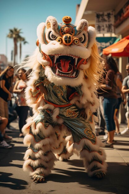 A colorfully dressed lion is running on the street happily, with smile and laughter, almost you can hear it.