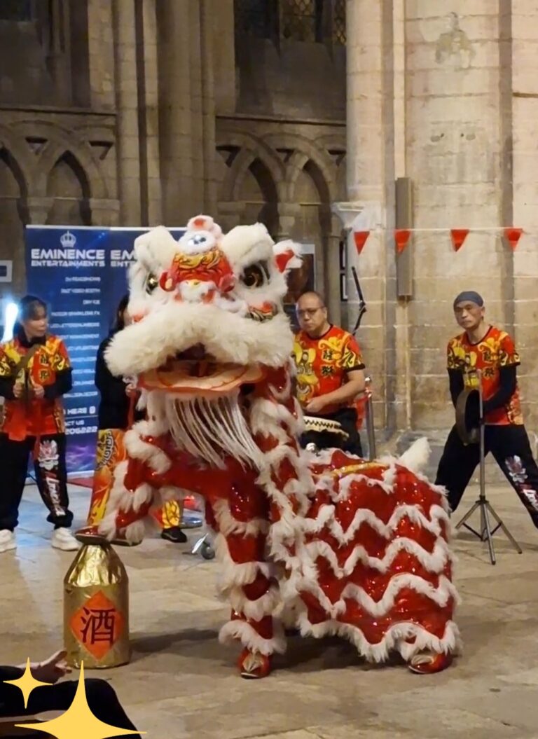 Our team consists of a group of people who are very passionate about Chinese lion dance and drumming, so much so that they practice regularly whenever they can. Some of my team members are Tai Chi and Wing Chun practitioners and most have had some form of Chinese Martial Arts and musical experiences in the past. Recently, we had perform a few Chinese New Year celebrations (i.e., 2024 Year of the Dragon), one at Peterborough Cathedral (top photo) where it was featured in Look East TV channel; the other one was at Cambridge Chinese Community Centre’s Celebration show on 10th February 2024. Normally in a year, we have other functions like shops openings, Dragon boat festival, Mid-Autumn festival, restaurants invitations, Xmas parties and Chinese New Year. All these means a continual practice is paramont in order to maintain the skill level, not so easy to organise regularly due to each of us has a different job. However, we will try because we love lion dance and drumming!